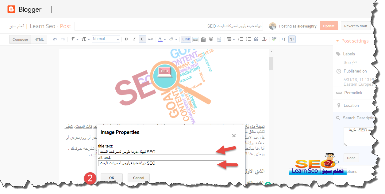 لابد حين قيامك برفع صوره داخل مقاله أن تتأكد أنها تحمل أسم بذات الموضوع بمعنى أنك تتحدث عن السيو لبلوجر واردت أن تضيف صوره فلابد ان تسمى الصوره على جهاز الكومبيوتر الخاص بك قبل رفعها كأن تعطيها اسم ” seo-blogger “; ومسموح استخدام الشرطه “-” أو بمعنى ادق يفضل استخدامها …وهكذا .